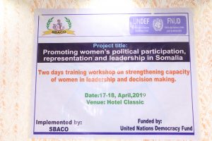 SBACO held a two day training workshop in 17th and 18 the, April, 2019 on strengthening the capacity of women in leadership and decision making in Galkacyo district in Puntland, Somalia. SBACO invited 40 participants from different target groups of 18 Youth, 10 Women activist, 10 Elders and 2 Local Councilors.